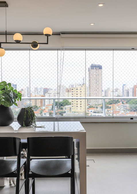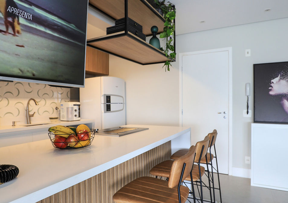 Neste apartamento de 100m², o grande destaque é a churrasqueira integrada à cozinha, pensada para clientes que adoram cozinhar e receber amigos. O projeto apostou na integração total dos ambientes para favorecer a socialização. Tons suaves de madeira, detalhes em preto e toques vibrantes de verde adicionaram personalidade e charme, criando um espaço acolhedor e cheio de estilo.